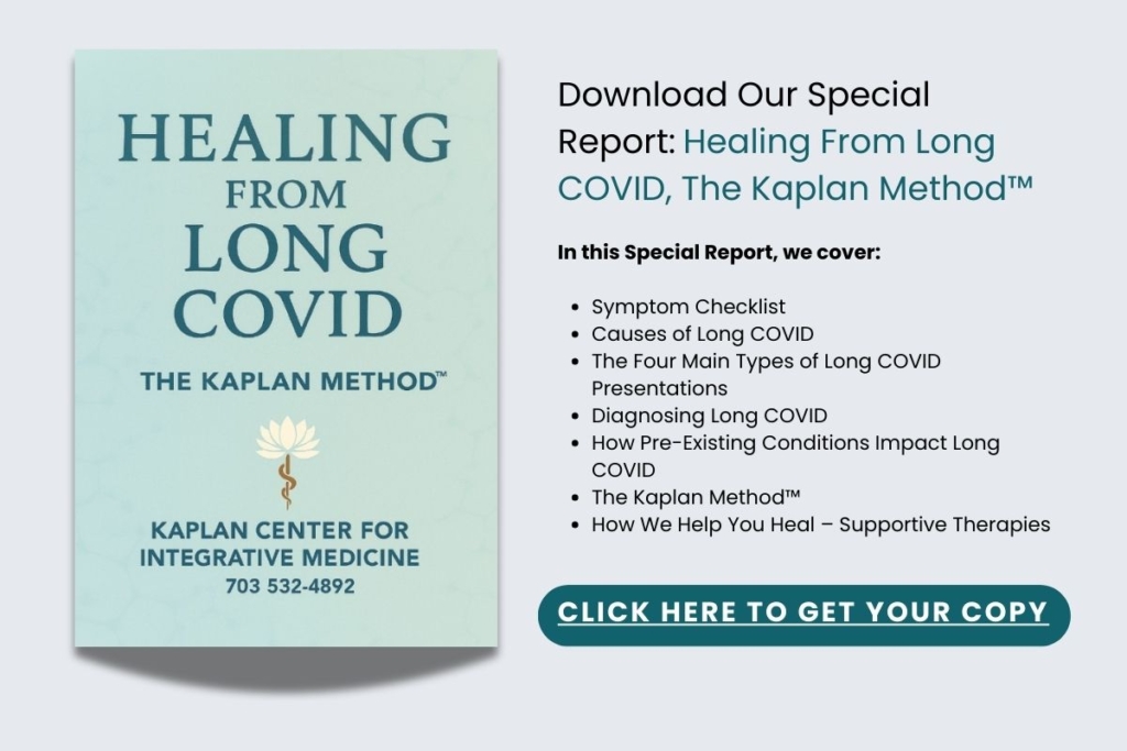 At the Kaplan Center, our physicians will take a thorough medical history and explore the onset of physical symptoms while equally considering an individual’s emotional well-being. We will ask you about previous illnesses and consider how your immune system may have previously been damaged in the past. We may explore possible exposure to toxins or heavy metals. We may also ask questions about how well your gastrointestinal system is functioning. All this information will give us a better understanding of your health to determine whether your symptoms solely due to COVID or if underlying illness may be contributing.